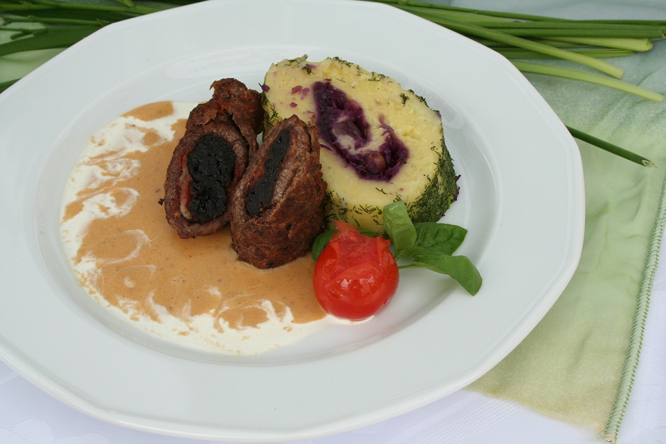 Rolada wołowa ze śliwkami i boczkiem z sosem śliwkowym w towarzystwie białych klusek śląskich faszerowanych czerwoną kapustą z rodzynkami