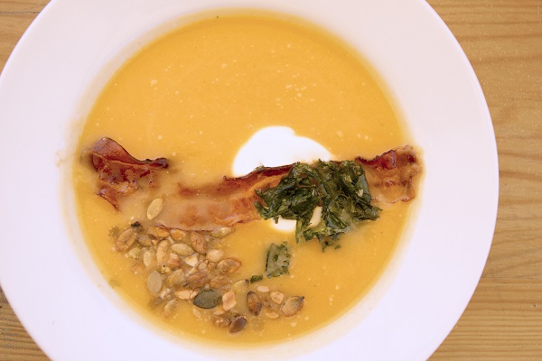 Marchew obrać, pokroić, podsmażyć na maśle. Przełożyć do garnka, dodać pieczoną dynię i zalać bulionem. Gotować do miękkości. Doprawić śmietanką. Sposób podania: na talerzu dekorować smażonym boczkiem, prażonymi pestkami, prażonym jarmużem.