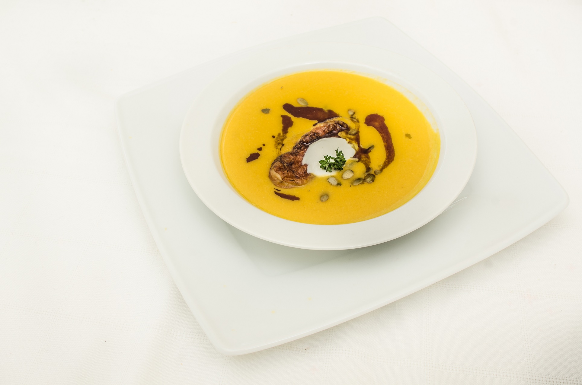 Por lekko zeszklić na maśle, dodajemy wino i pieczoną dynię dusimy; dodajemy bulion, zagotowujemy i doprawiamy zupę śmietaną. Danie podajemy w bulionówce udekorowane tartym serem, prażonymi pestkami i prażoną pietruszką.