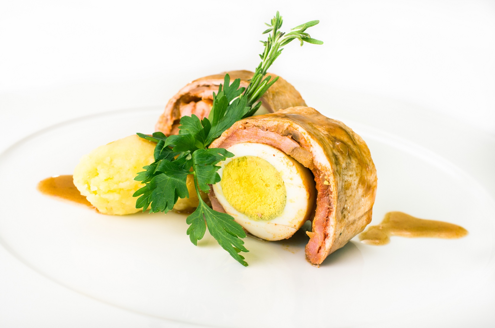 Umyte mięso osuszyć i pokroić na 10 plastrów, lekko rozbić tłuczkiem. Musztardę wymieszać z koncentratem pomidorowym. Obraną cebulę pokroić w kostkę. Każdy plaster mięsa posolić, posmarować musztardą z koncentratem pomidorowym. Na każdym rozłożyć po dwa plasterki boczku i posiekaną cebulę, a na niej jajo. Plastry mięsa zwinąć w rulonik, obwiązać nitką, oprószyć mąką i obsmażyć na smalcu. Przełożyć do rondla, dodać masło, ziele angielskie i listek laurowy, skropić wodą i dusić na małym ogniu, od czasu do czasu potrząsając rondlem, aby się nie przypaliły. Przed podaniem usunąć nitki. Podawać przekrojone wzdłuż na pół, jajkiem do góry, na postumencie z ziemniaków purée, polane sosem spod duszonego mięsa.