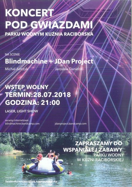 W sobotę, 28 lipca na terenie parku wodnego "Wodnik" w Kuźni Raciborskiej odbędzie się koncert pod gwiazdami, w którym wystąpi Michał Jurczyk (znany jako Blindmachine) i Jarosław Danielski (JDan Project). Zapraszamy do wspaniałej zabawy. Start o godz. 21:00. Wstęp wolny!