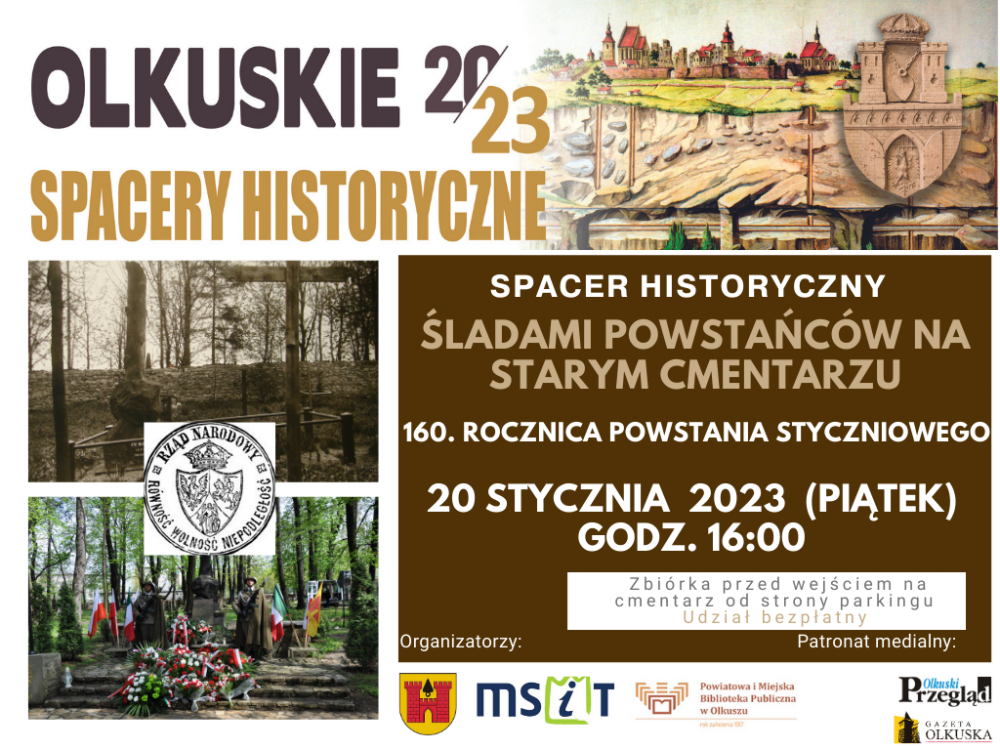 Zapraszamy w piątek 20 stycznia do udziału w spacerze historycznym „Śladami powstańców na Starym Cmentarzu”, który inauguruje tegoroczną akcję „Olkuskie Spacery Historyczne 2023”, organizowaną przez Urząd Miasta i Gminy w Olkuszu we współpracy z partnerami.