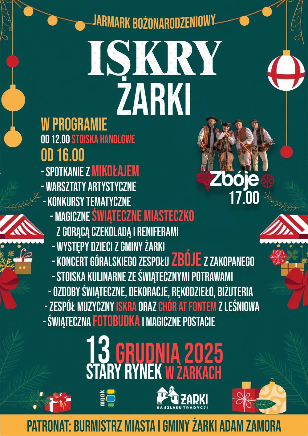 Bur­mistrz Mia­sta i Gminy Żarki Adam Za­mo­ra ser­decz­nie za­pra­sza miesz­kań­ców oraz gości do wspól­ne­go świę­to­wa­nia pod­czas ISKIER 2025 – Jar­mar­ku Bo­żo­na­ro­dze­nio­we­go, który od­bę­dzie się 13 grud­nia (so­bo­ta) na Sta­rym Rynku w Żar­kach. To wy­jąt­ko­wy czas, kiedy Żarki roz­iskrza się świą­tecz­nym bla­skiem – od żaru zi­mo­wych świa­te­łek po drob­ne iskry ra­do­ści, które łączą ludzi i tra­dy­cje. Za­pra­sza­my do współ­two­rze­nia at­mos­fe­ry, która roz­świe­tla Jurę Krakowsko-Częstochowską jesz­cze moc­niej.