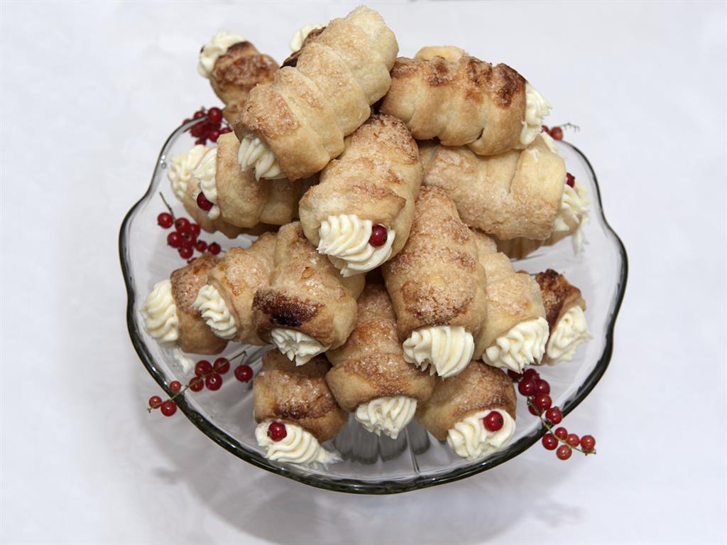 Mąkę wsypać do miski dodając szczyptę soli; margarynę zamrozić i zetrzeć na grubej tarce. Do mąki dodać śmietanę i zagnieść ciasto, rozwałkować cztery razy i odstawić do lodówki; piec w temp. 200oC na metalowych foremkach.