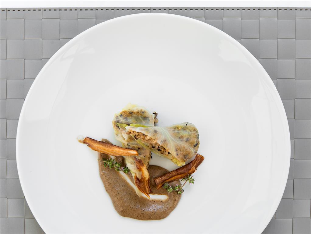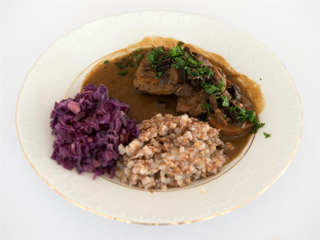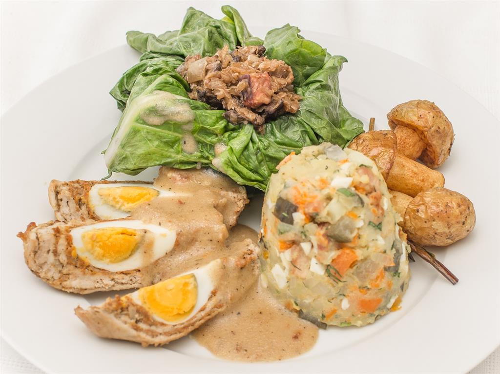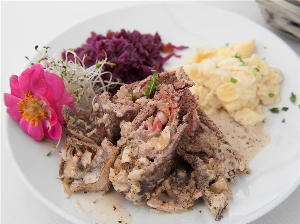 Rozbef wołowy rozbijamy na cienki plaster. Boczek wędzony zwijamy w roladę wołową i dusimy dusimy z rydzami i warzywami w śmietanie i czerwonym winie. Z mąki i jaj przygotowujemy lane kluski. Kapustę czerwoną szatkujemy, dusimy na smalcu z rodzynkami. Pokrojoną w plastry roladę serwujemy na duszonych rydzach i z kluseczkami podanymi na talerzu obiadowym.