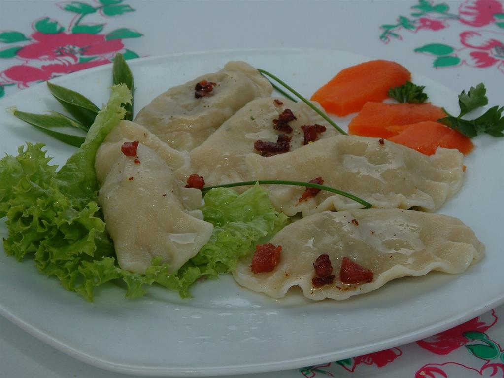 Przygotować farsz: grzyby namoczyć na 12 godzin w słodkim mleku. Następnie ugotować w osolonej wodzie, ostudzić i drobno pokroić. Grzyby zesmażyć z posiekaną cebulą, doprawić solą i pieprzem. Przygotować ciasto: mąkę uformować w stożek z wgłębieniem pośrodku. Wlać do niego olej i wodę, powoli zarabiając. Kiedy powstanie spoista masa, wyrabiać ciasto tak długo, aż będzie gładkie i elastyczne.