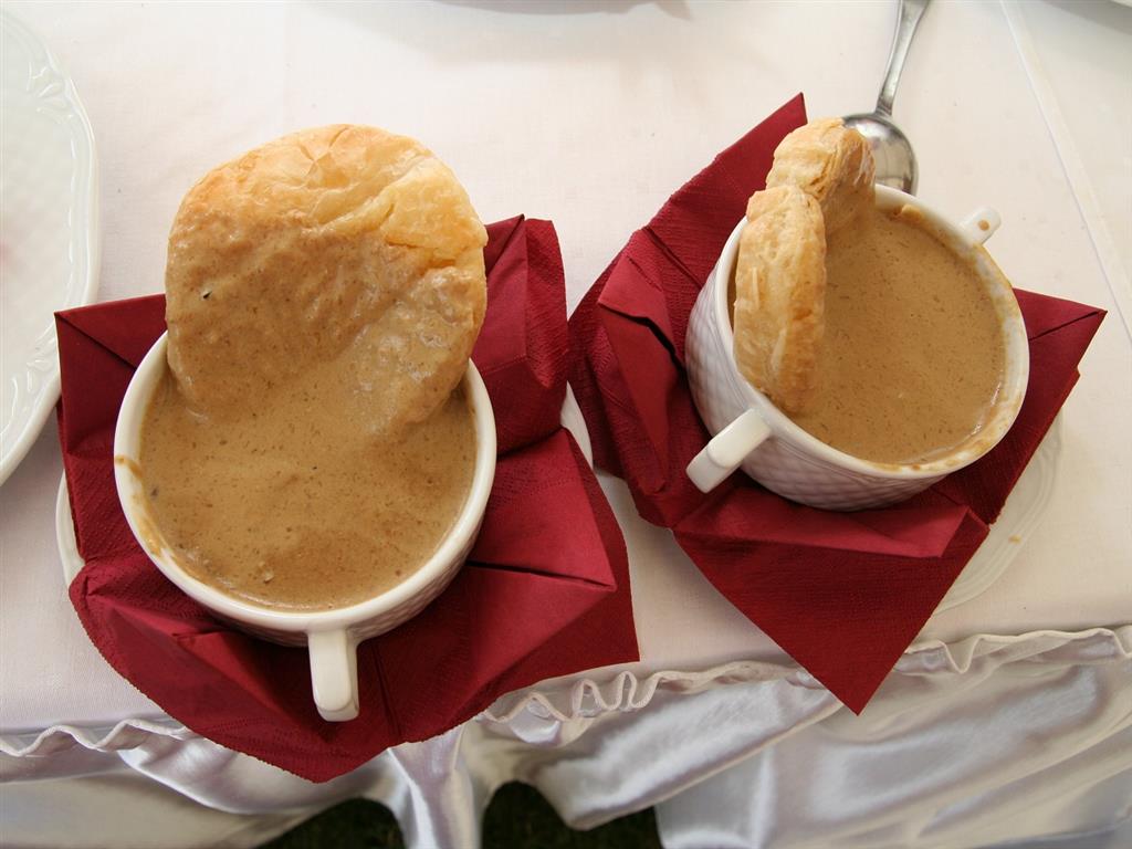 Zeszkloną cebulkę wraz z borowikami zalewamy wywarem warzywnym, miksujemy, zabielamy słodką śmietaną i zagęszczamy żółtkami jaj. Doprawiamy do smaku solą, pieprzem i owocami jałowca. Krem zapieka się pod ciastem francuskim.