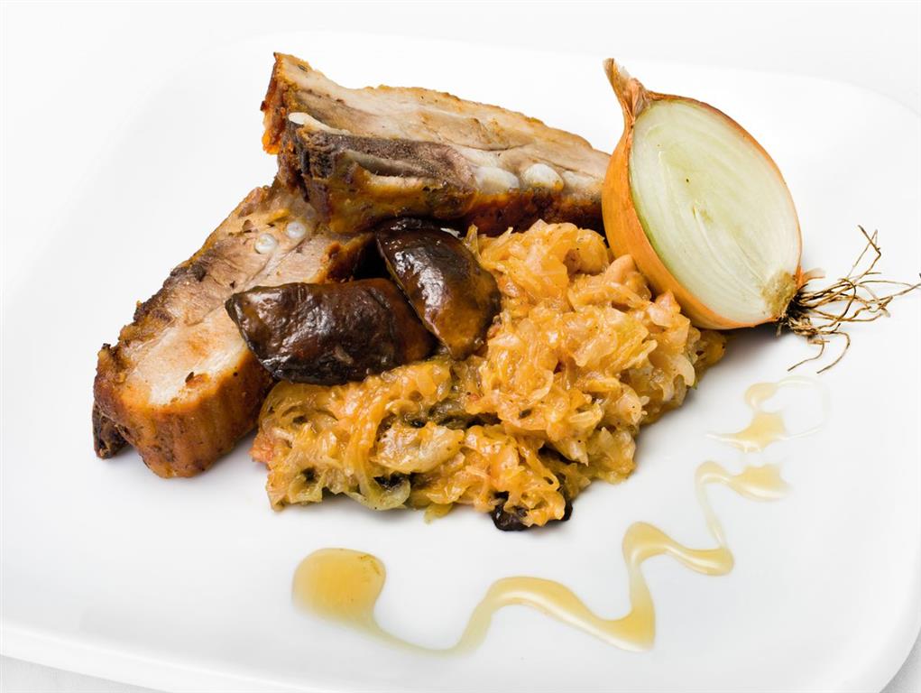 Cebule pokroić i usmażyć, dodać pokrojone żeberka i dusić do miękkości. Do mięsa dodać miód i przyprawy, podlać wodą i gotować aż do jej odparowania. Doprawić do smaku. Do wcześniej ugotowanej kapusty dodać usmażony pokrojony w kostkę boczek i suszone grzyby namoczone w mleku. Dusić na małym ogniu, przyprawić do smaku. Podawać z żeberkami, na ciepło.