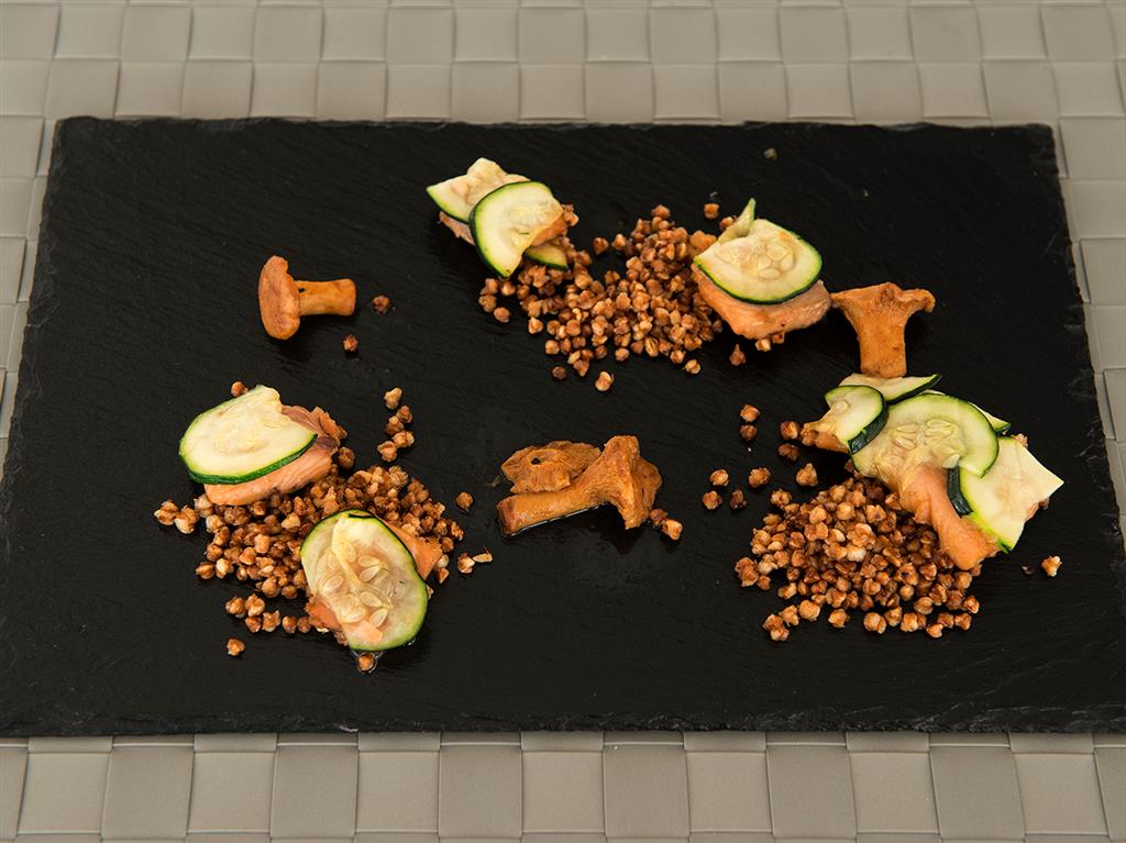 Filet z pstrąga opłukać, dokładnie odsączyć. Następnie rozgrzewać oliwę do 55oC i dodać skórkę z cytryny, zanurzyć cały filet. I 'gotować' przez 15-20 minut. Po upływie tego czasu wyciągnąć nasz filet i położyć na ręcznik papierowy. Lekko piklowane cienkie plasterki cukinii kłaść na zwilżonej miodem skórze pstrąga, podsmażyć.