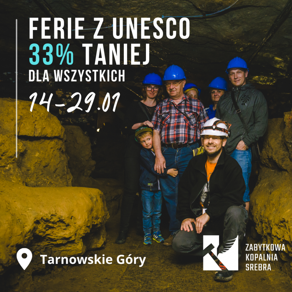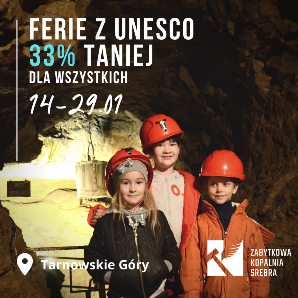 Od 14 do 29 stycznia zapraszamy na „Ferie z UNESCO 33% taniej dla wszystkich". Zachęcamy, żeby zimową przerwę od szkoły wykorzystać aktywnie w Zabytkowej Kopalni Srebra oraz Sztolni Czarnego Pstrąga w Tarnowskich Górach. Ceny biletów obniżamy aż o 1/3.