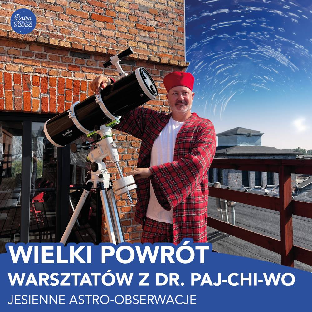 Tym razem skupimy naszą uwagę na gwiazdozbiorach nieba jesiennego, którym będą towarzyszyli Księżyc, Saturn i Jowisz. Uczestnicy warsztatów zapoznają się z mitami na temat gwiazdozbiorów, będą obserwować niebo za pomocą reflektora, przepatrywać powierzchnię Księżyca w ostatniej kwadrze, podziwiać księżyce galileuszowe Jowisza oraz odnajdą pierścienie Saturna. Na koniec Dr Paj-Chi-Wo przygotuje chemiczną niespodziankę!