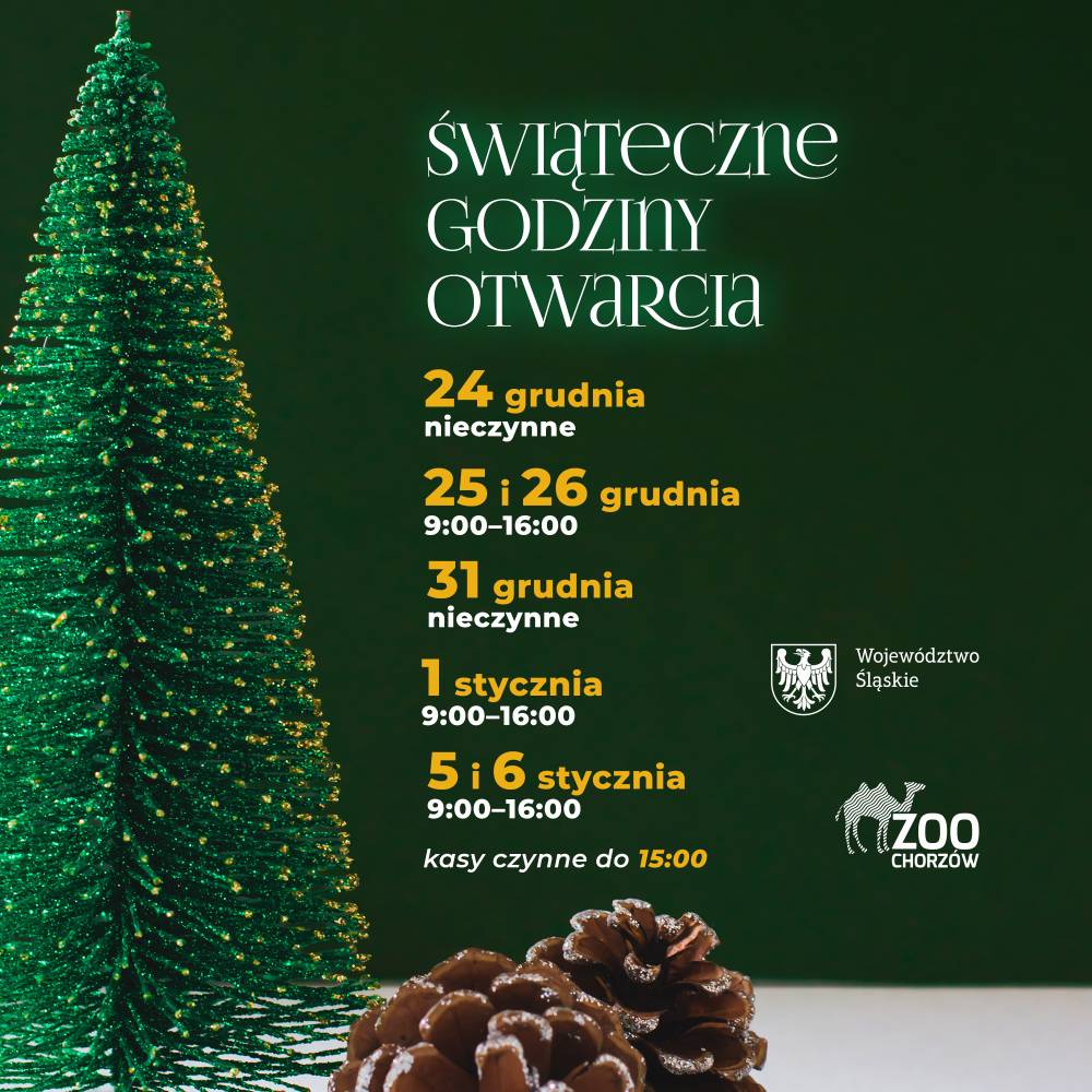 • 26 grudnia (drugi dzień świąt) – ZOO czynne w godz. 9:00–16:00 (wstęp do 15:00)