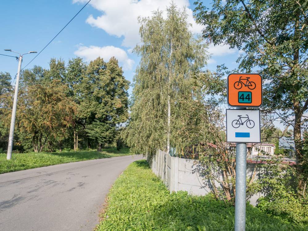 Niebieski szlak rowerowy nr 9 Euroregionu Śląsk Cieszyński: Strumień - Jastrzębie-Zdrój, oznakowanie, fot. Damian Berłowski - roweremposlasku.pl