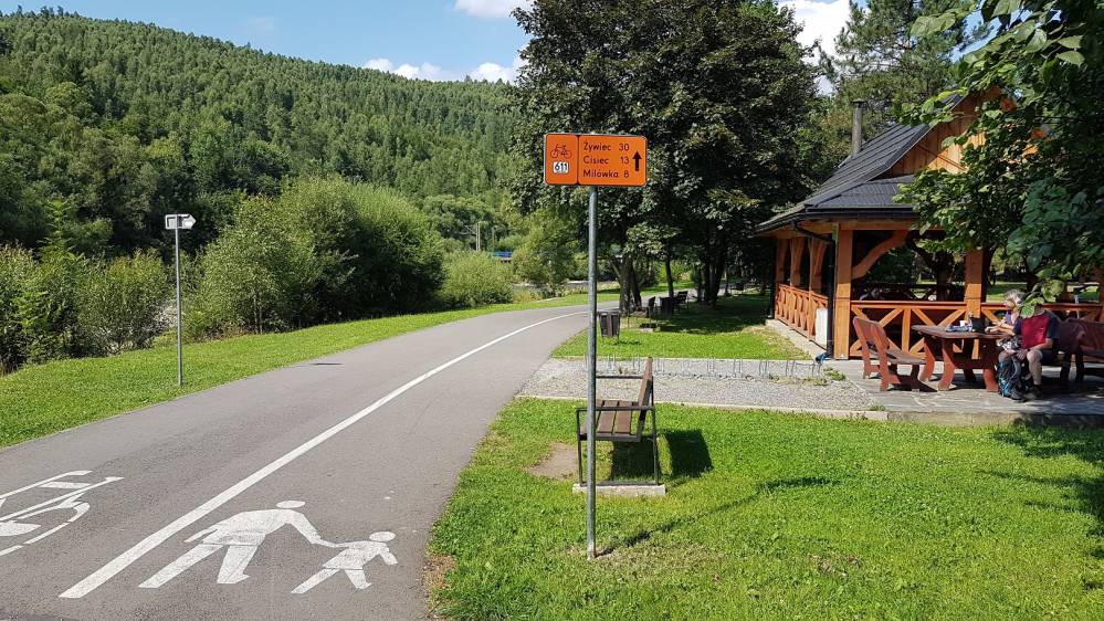 W Żywcu trasa nie prowadzi przez centrum miasta, ale aby dojechać do żywieckiego rynku i Pałacu Habsburgów otoczonego zabytkowym parkiem, wystarczy odbić kilkaset metrów od przebiegu szlaku. Po drodze warto zrobić przystanek w Arcyksiążęcym Browarze, w którym można zwiedzić ciekawe Muzeum Browaru Żywiec albo zjeść pyszny obiad. Do wszystkich tych miejsc kieruje oznakowanie szlaku Velo Soła. Ostatni odcinek trasy prowadzący wzdłuż brzegu Jeziora Żywieckiego dostarcza niezwykłych widoków na beskidzkie szczyty odbijające się w tafli jeziora, dla których warto pokonać ten odcinek w dwie strony, ponieważ z końca znakowanej trasy Velo Soła trzeba wrócić do Żywca, jeśli planujecie wrócić do domu pociągiem.