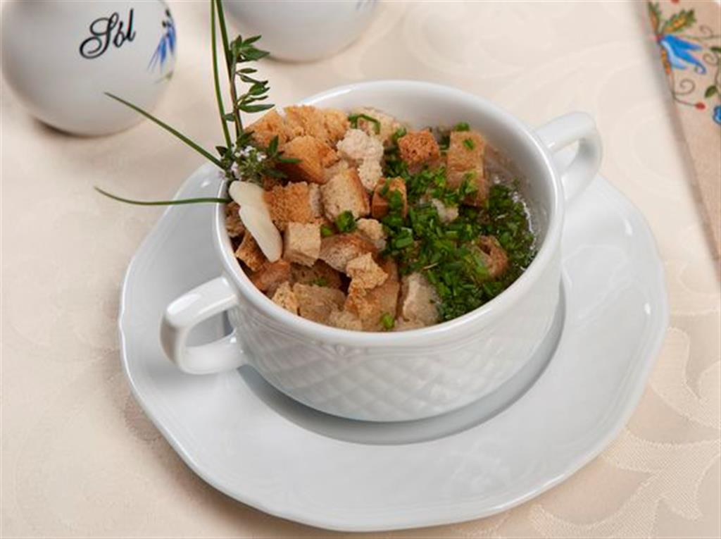 Tradycyjna śląska zupa świadcząca o zaradności śląskich gospodyń domowych. Przygotowana na bazie czerstwego chleba, czosnku i tłuszczu. Zdrowa i rozgrzewająca.
